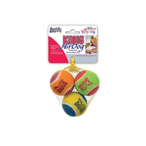 KONG AirDog Squeaker Birthday Balls will make any dog's birthday a hit. Constructed from non-abrasive tennis ball fabric that will not wear down dog's teeth. All squeaker units are recessed in rubber and covered with tennis ball fabric for safety. These colorful versions of the popular Air Dog Squeakair Tennis Balls are imprinted with a Happy Birthday" logo and come three to a package. This high floating toy is perfect for all dogs that love to fetch.
