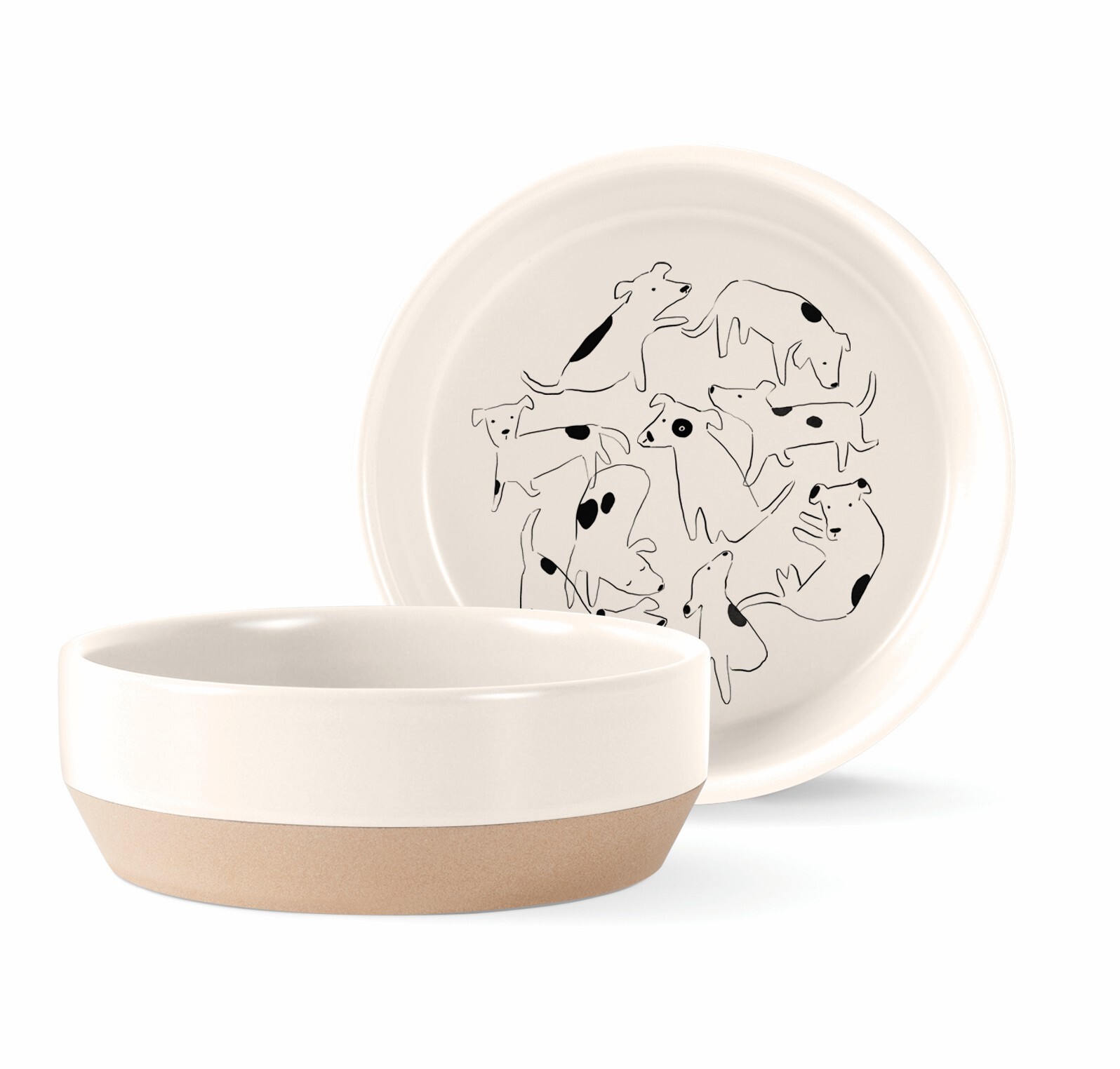 - Medium round stoneware dog food and water bowl with decal art inside bowl