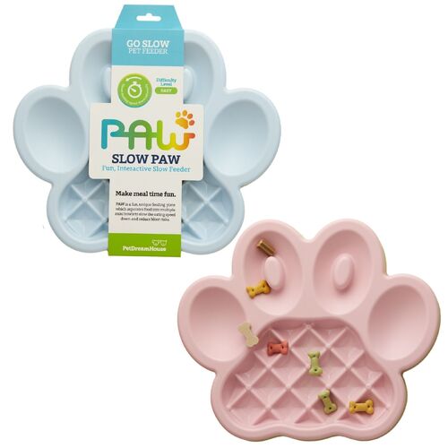 - Slow feeder paw-shaped platter for dogs designed for stimulation and paced eating