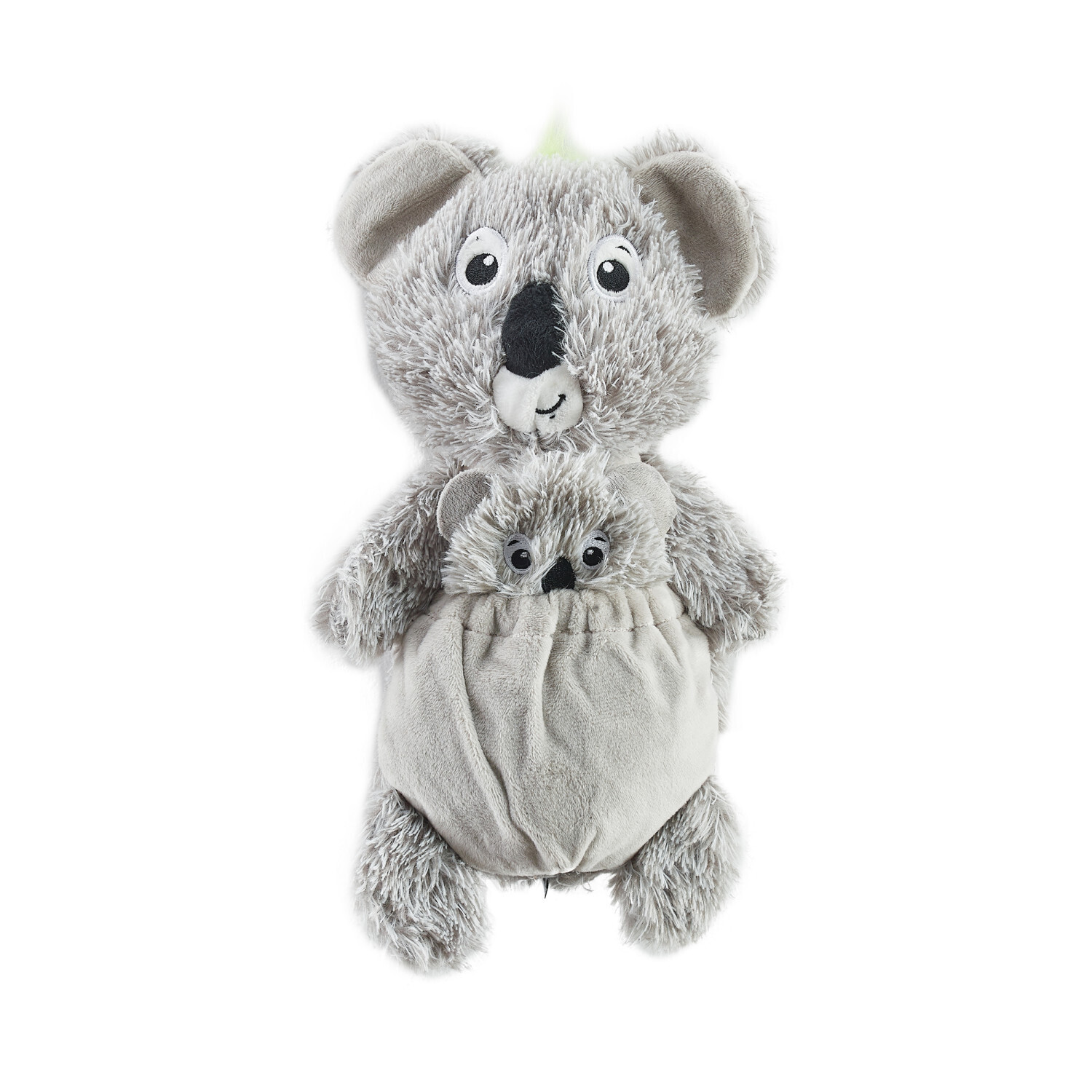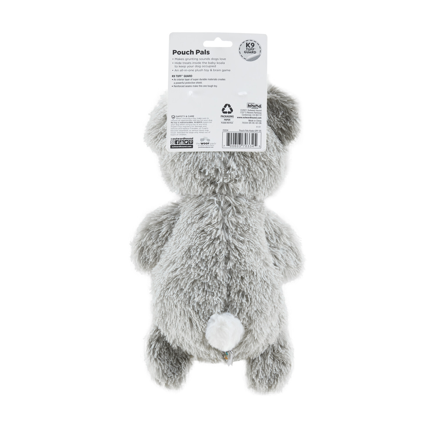 The Outward Hound’s Charming Pet Pouch Pals Koala is a 2-in-1 treat-hiding plush dog toy featuring a mama koala with a grunting noisemaker and a baby koala with a hidden treat compartment to hide treats or dog kibble inside.